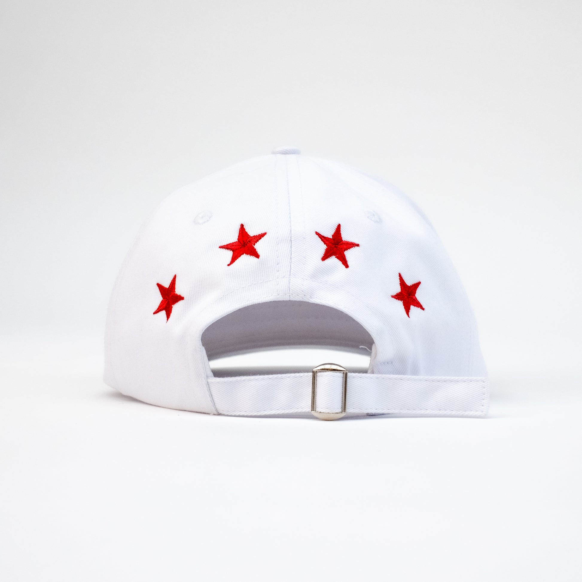 Timeless white cap embroidery deatils perfect for everyday wear. Stars across the back in red stitching with small signature A detail on the left side.